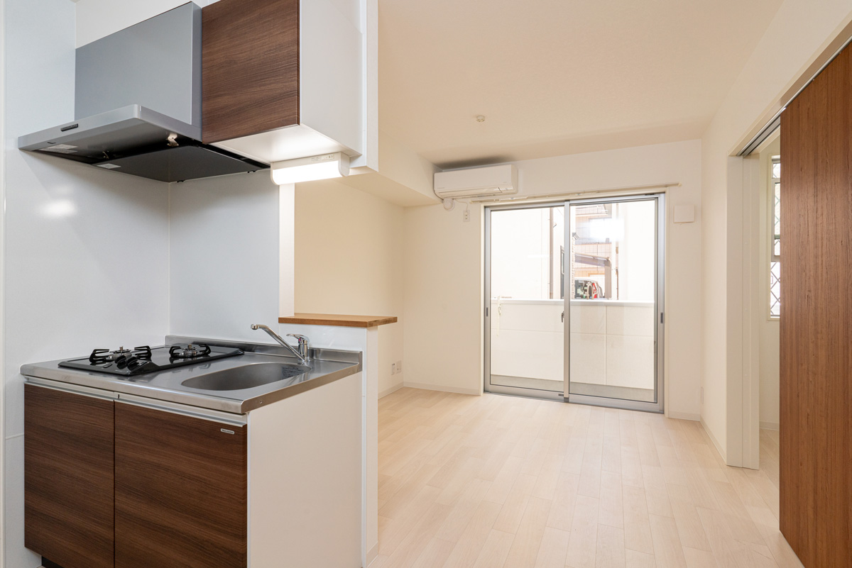 エハコ日暮通|キッチンからリビング~ベランダを望んだ写真です。ベランダに面した窓はシャッター付。※シャッターを開けた状態で写真撮影しています。